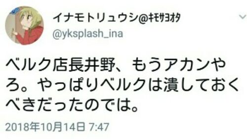 twitter.com tekitou_second(https://twitter.com/tekitou_second?s=20)っていう人、ベルク店長とイナモトを両方フォローしているんだ(笑) ベルク店長井野、もうアカンやろ。やっぱりベルクは潰しておくべきだったのでは。 — イナモトリュウシ ∃xist@キモオタサハ …