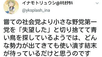 嘗ての社会党より小さな野党第一党を「失望した」と切り捨てて青い鳥を探しているようでは、どんな勢力が出てきても使い潰す結末が待っているだけと思うのですが。